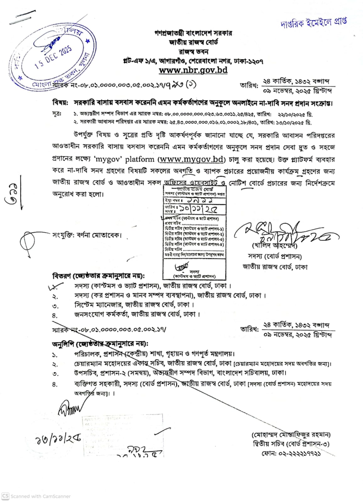 | ১০ | সরকারি বাসায় বসবাস করেননি এমন কর্মকর্তাগণের অনুকূলে অনলাইনে না-দাবি সনদ প্রদান সংক্রান্ত | | | ১৫-১২-২০২৫ | দেখুন |